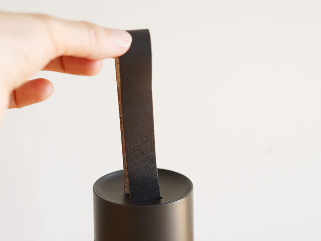 どこでも持ち運んで置けるのはもちろん、本革の伸長式ストラップを使って、コートハンガーなどに吊るすことが可能。置くだけではないフレキシブルさも魅力です。