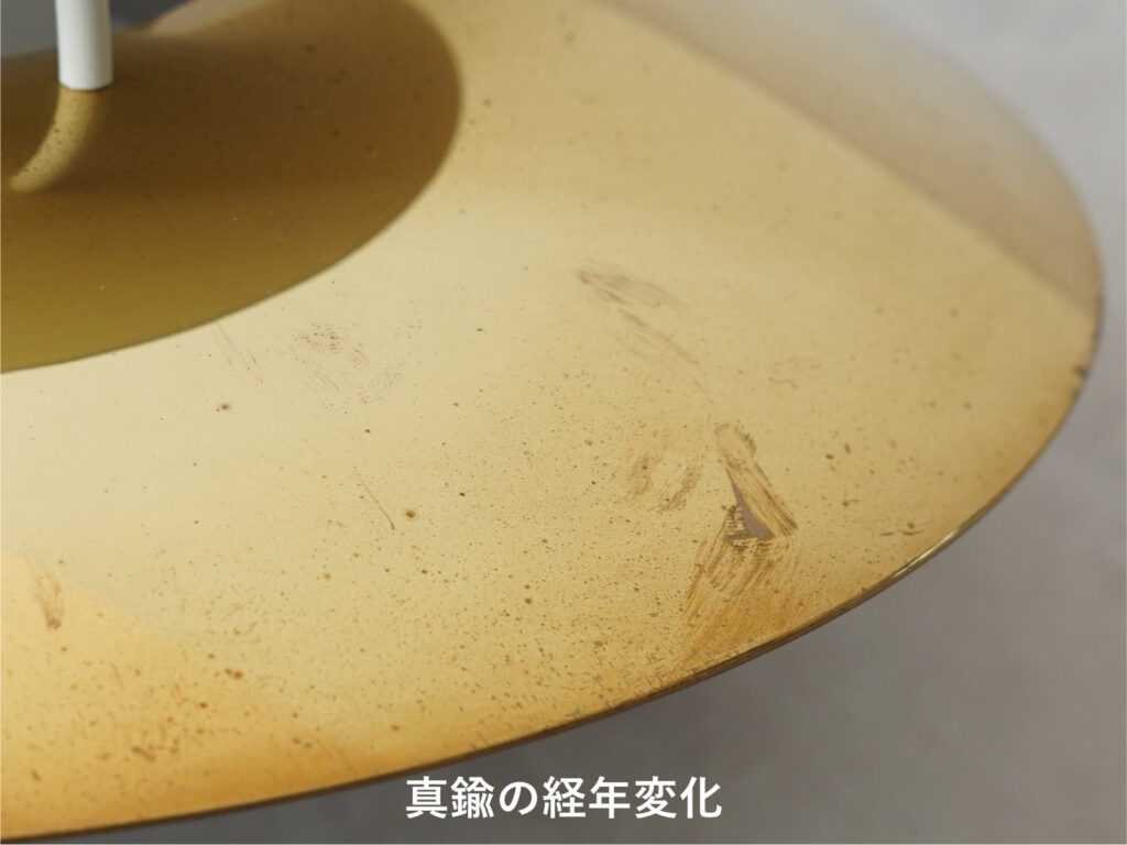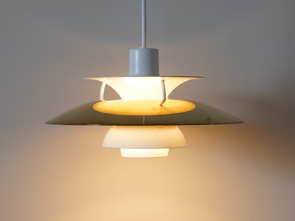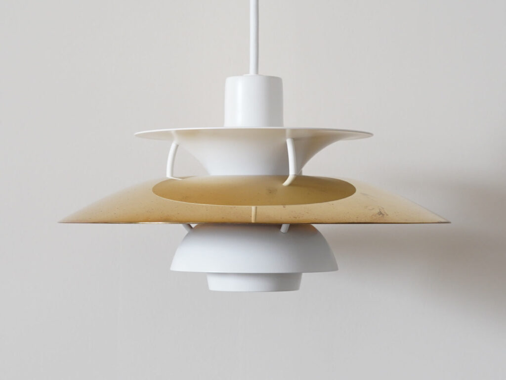 PH5ミニにはさまざまなカラーバリエーションがありますが、こちらのシェードおよび内部リフレクターには無垢の真鍮が用いられています。真鍮ならではの経年変化が随所にみられ、風合いのある佇まいです。